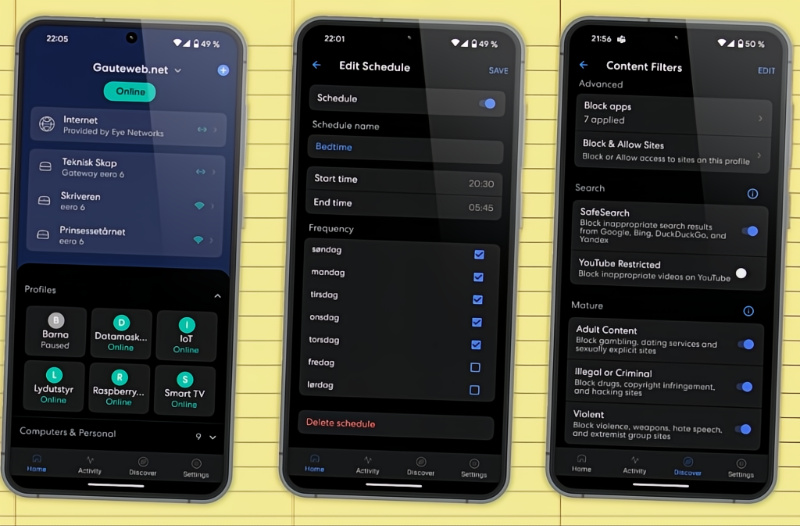 I tillegg har jeg valgt at Eero skal filtrere bort alle websider som inneholder «voksen innhold» (les porno), vold og andre ulovlige aktiviteter. Dette er en svarteliste som vedlikeholdes av Eero, så jeg har ikke tilgang til å se eller styre denne listen, men jeg kan i tillegg blokkere enkelt-nettsider manuelt. Jeg har også slått på at Eero filtrerer Google-søk (og de fleste andre søkemotorer) barna gjør, samt at jeg har blokkert de fleste sosiale medier apper fra å få tilgang til internett (iPhone og iPad med SIM-kort finner dog veier rundt dette desverre).
