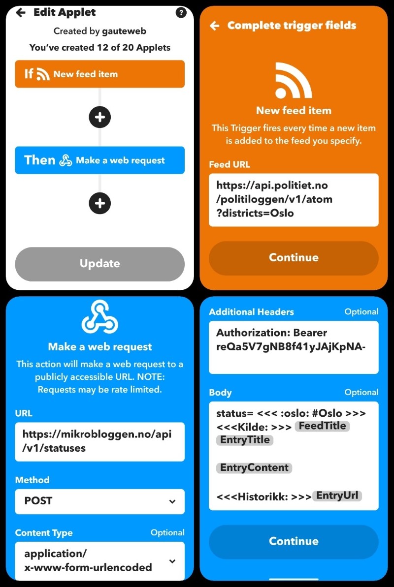Følg gjerne min Bot som poster statusmeldinger og nyheter (en annen RSS feed, også satt opp som en IFTTT applet på samme måte) fra Oslo Politidistrikt: @politiloggen_oslo@mikrobloggen.no
